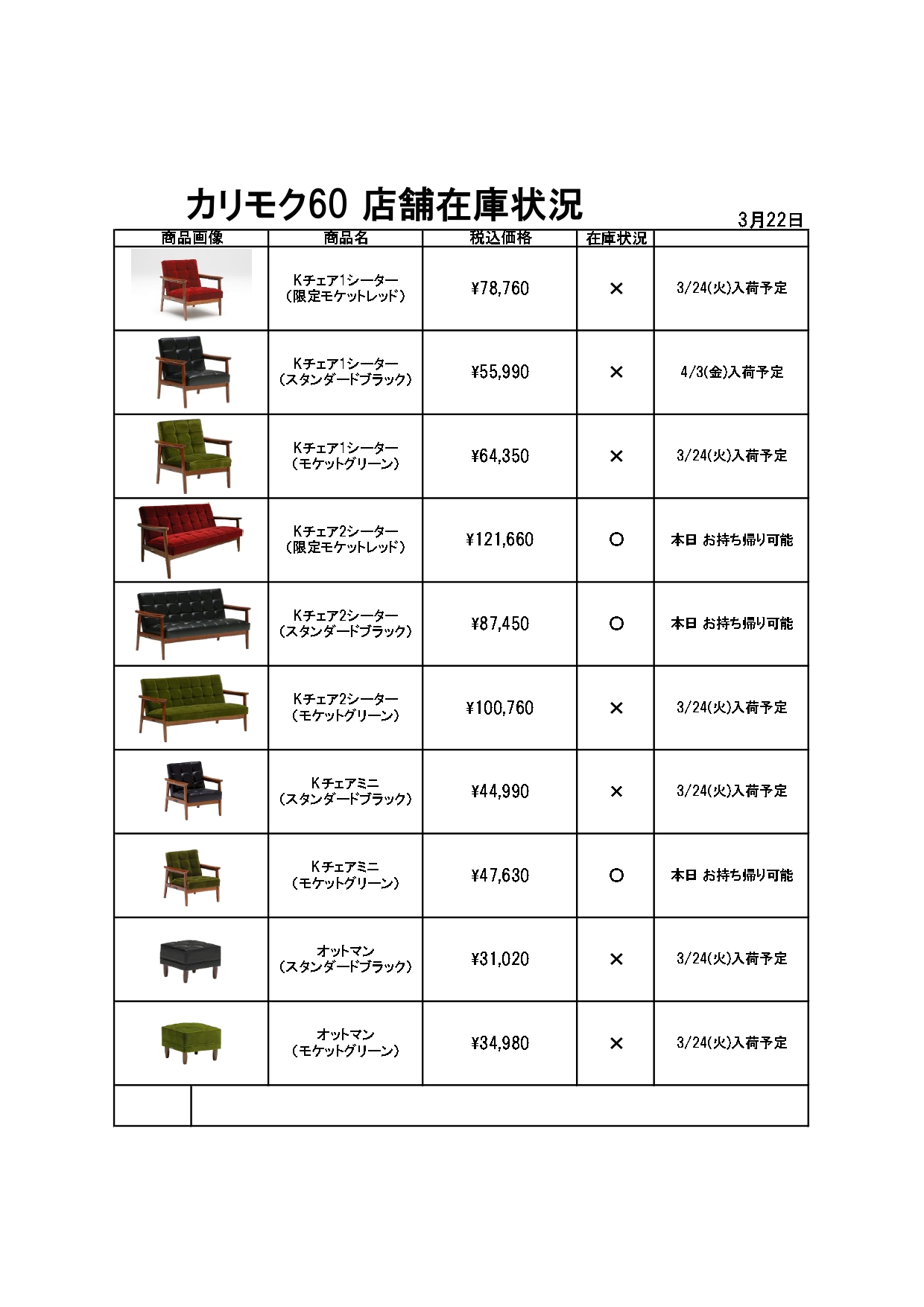 【3月22日(日)カリモク60商品店舗在庫状況】